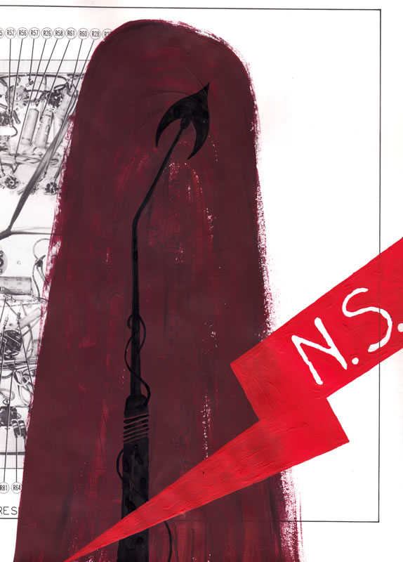 (8 inches by 11 inches; acrylic paint, colored pencil and ink on found paper; September 5, 2009)